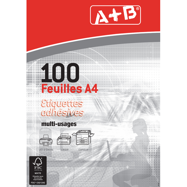 Spécialement conçues pour imprimantes laser. jet d'encre et copieurs. Les formats d'étiquettes A+B sont déjà intégrés dans les principaux logiciels bureautiques. Boite de 100 planches A4.