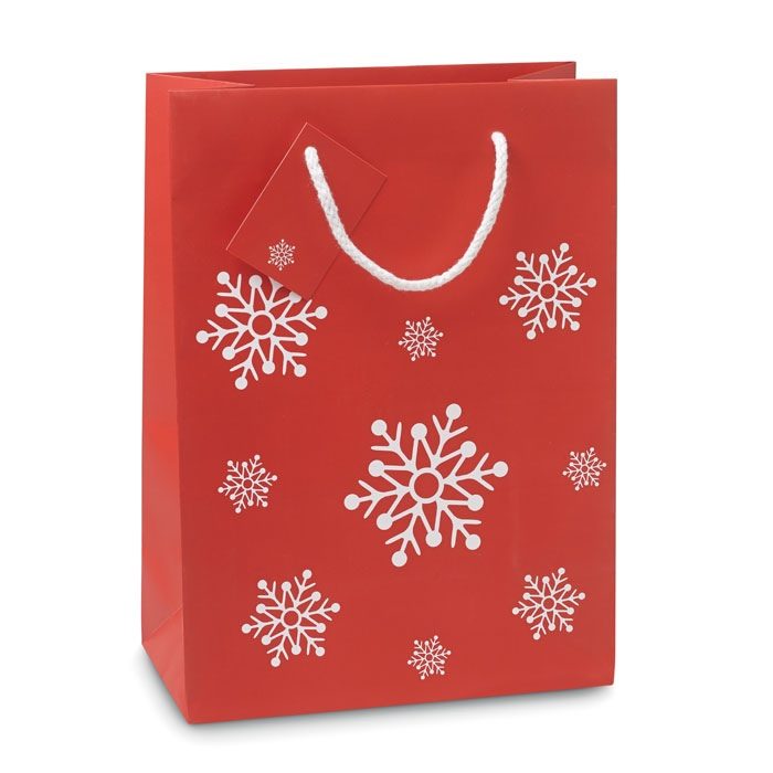Elégant sac cadeau en papier décoré de motifs de flocons de neige. Petite carte message incluse. Moyen modèle.