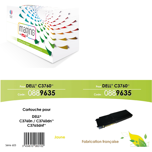 Cartouche compatible jaune pour imprimantes : Dell C3760N / C3760DN / Dell C3765DNF / Nbre de pages 9.000 <(><<)>Ref.Dell F8N91 / 593-11120>