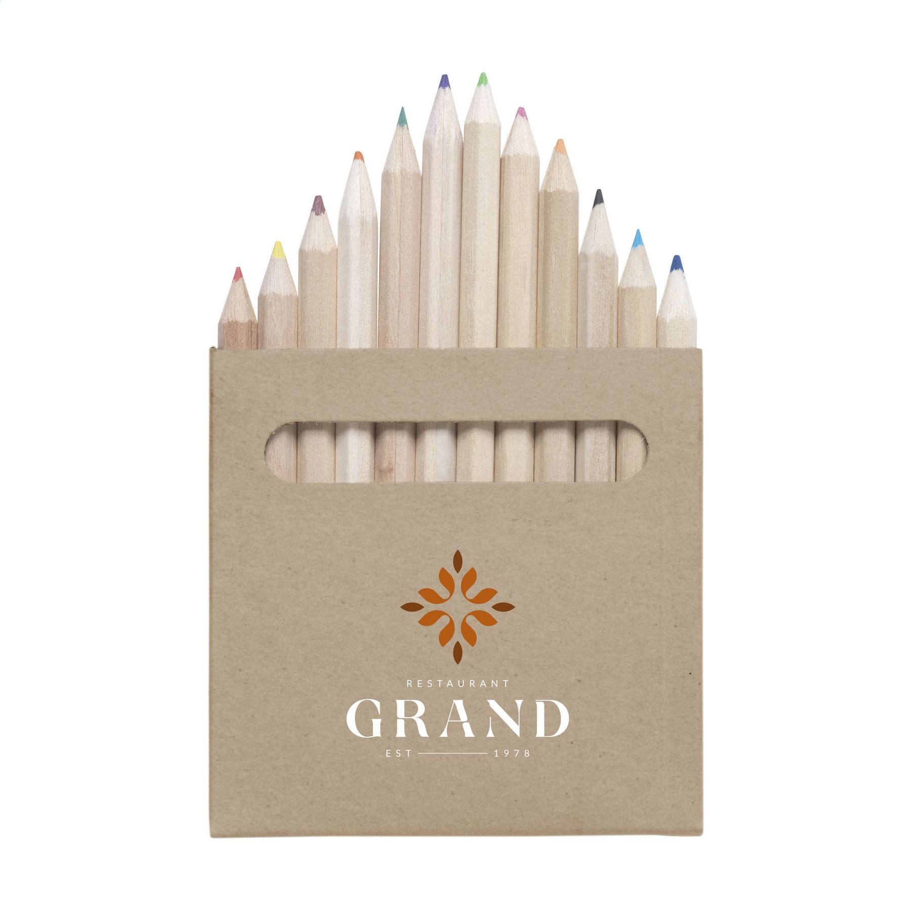 12 crayons de couleur artisanaux en bois uni, dans une boîte en carton recyclé.
