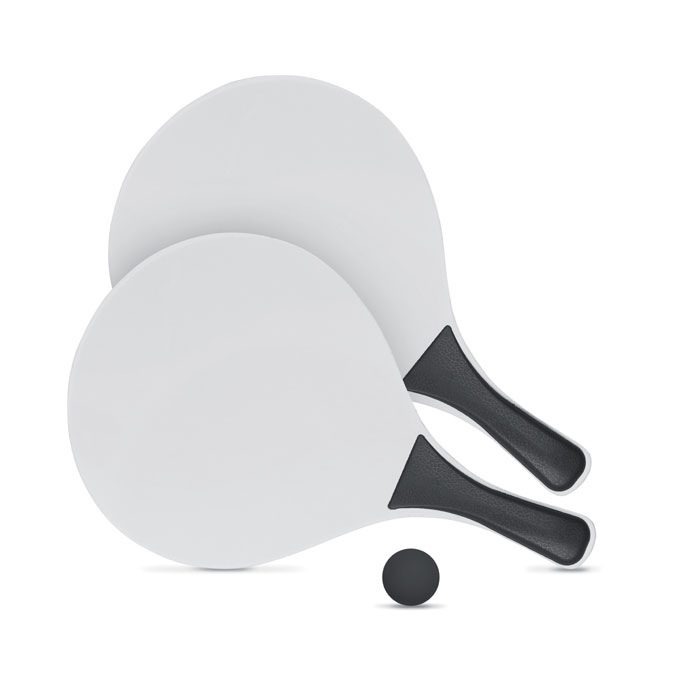 Set de tennis de plage constitué de 2 raquettes (MDF) et d’une balle souple.
