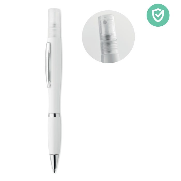 Stylo à bille antibactérien à bouton-poussoir avec corps en ABS et vaporisateur rechargeable (4ml) livré vide. ISO 22196. Encre bleue.