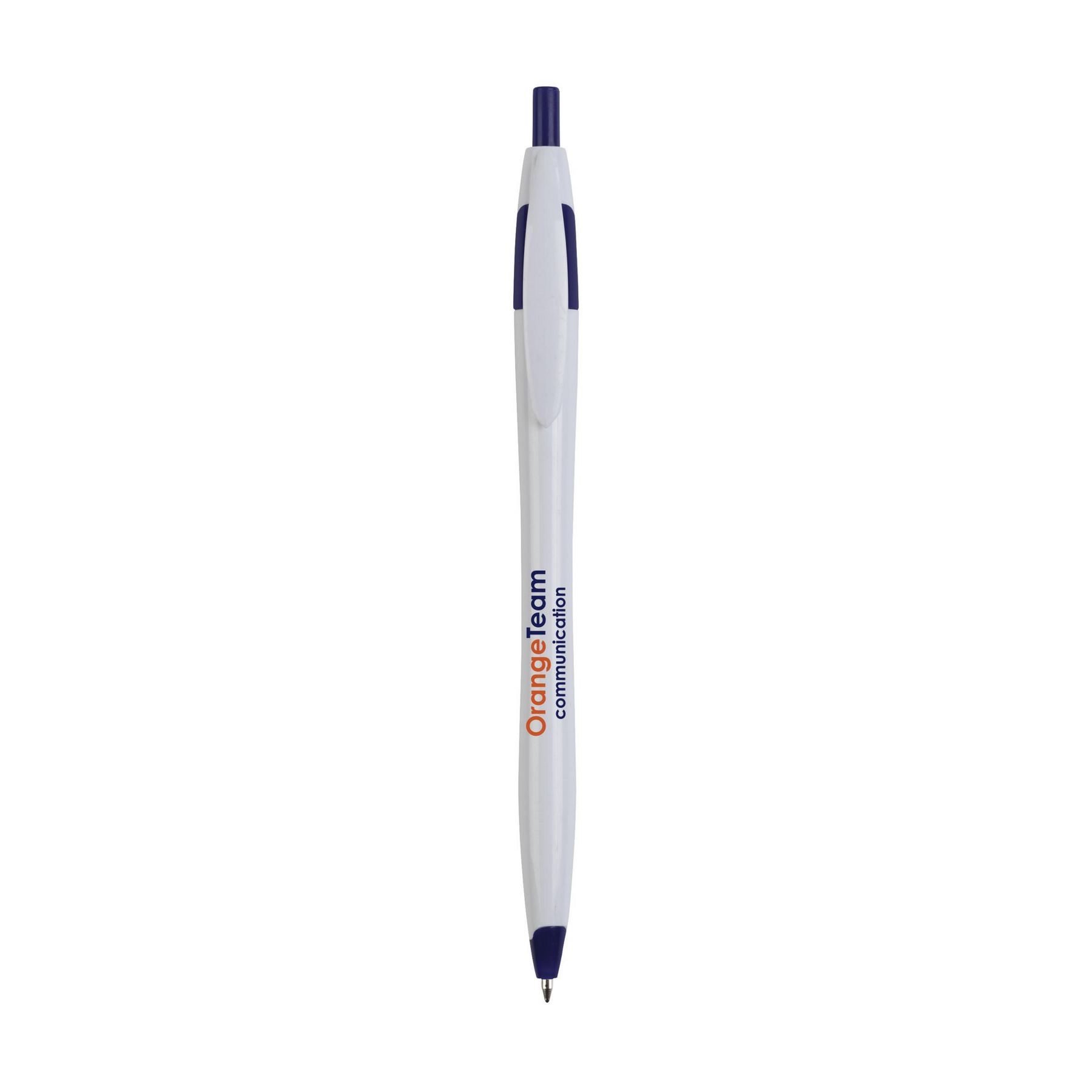 Stylo promotionnel à encre bleue, avec corps élancé et accents colorés.